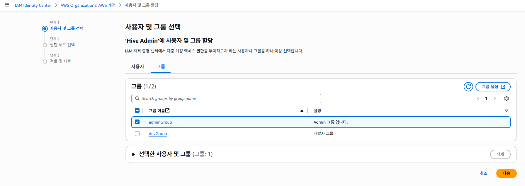 - 이전에 만들어 놓았던 AdminGroup을 선택후 [다음] 버튼 클릭
