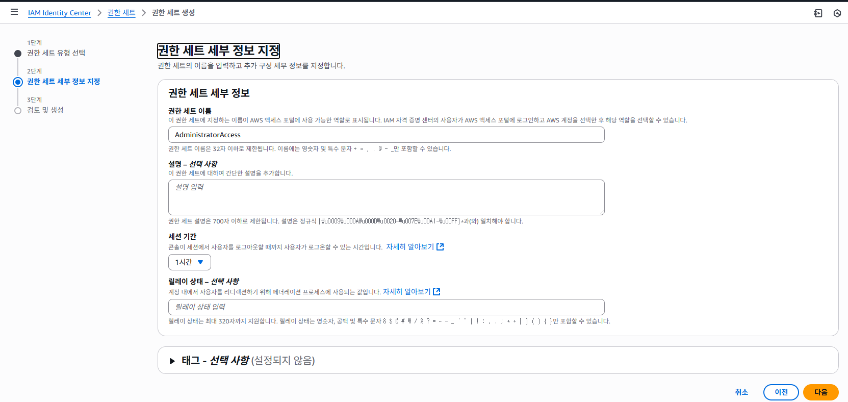 - 이전에 만들어 놓았던 AdministratorAccess 권한 세트 선택후 [다음] 버튼 클릭