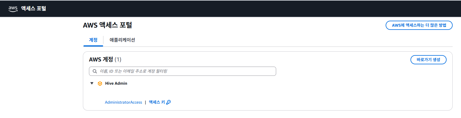 - Access Portal로 로그인 이후 계정 선택하고 AdministratorAccess 클릭시 AWS Console 화면으로 이동함.