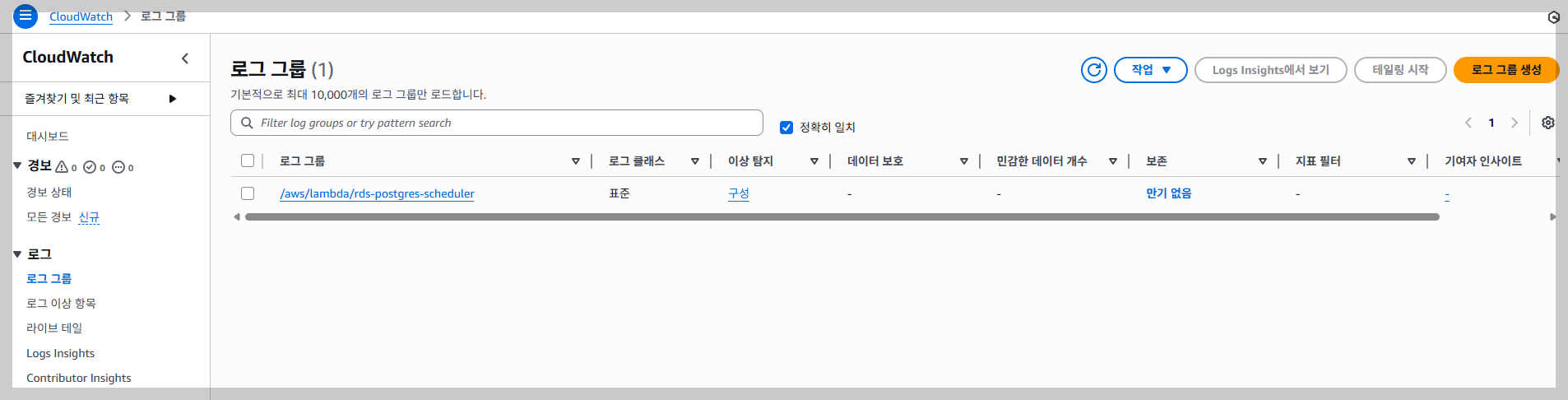 AWS 콘솔 → CloudWatch → Logs → Log groups → /aws/lambda/rds-postgres-scheduler