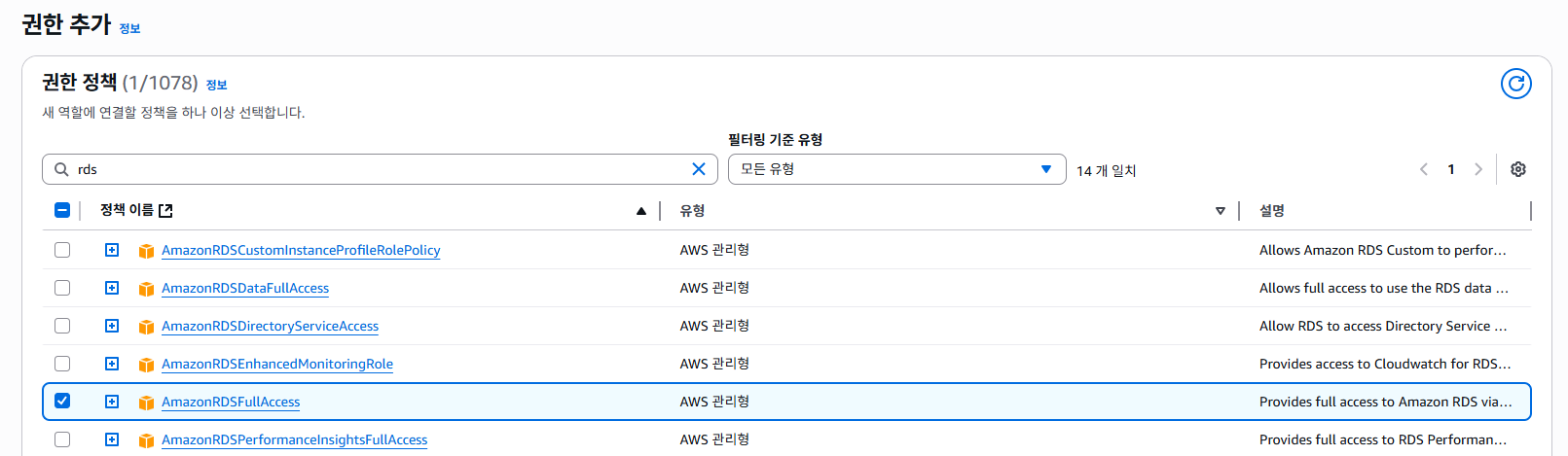 ✅ AmazonRDSFullAccess 선택
