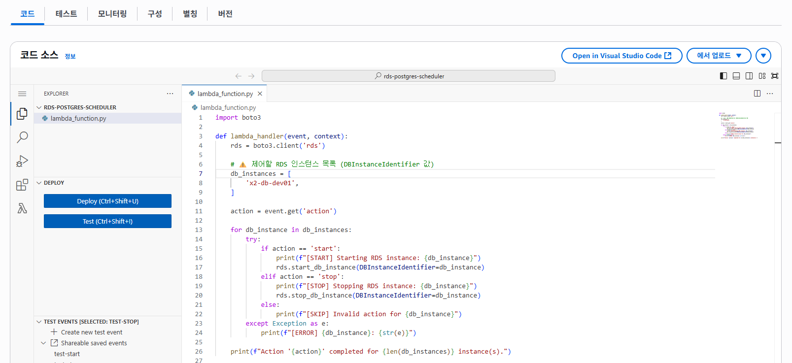 2️⃣ Lambda 함수 생성 (RDS Start/Stop 코드)