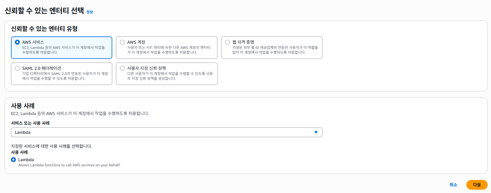 - 사용 사례 → Lambda 선택 → [다음]