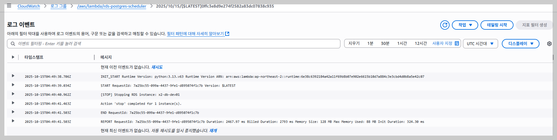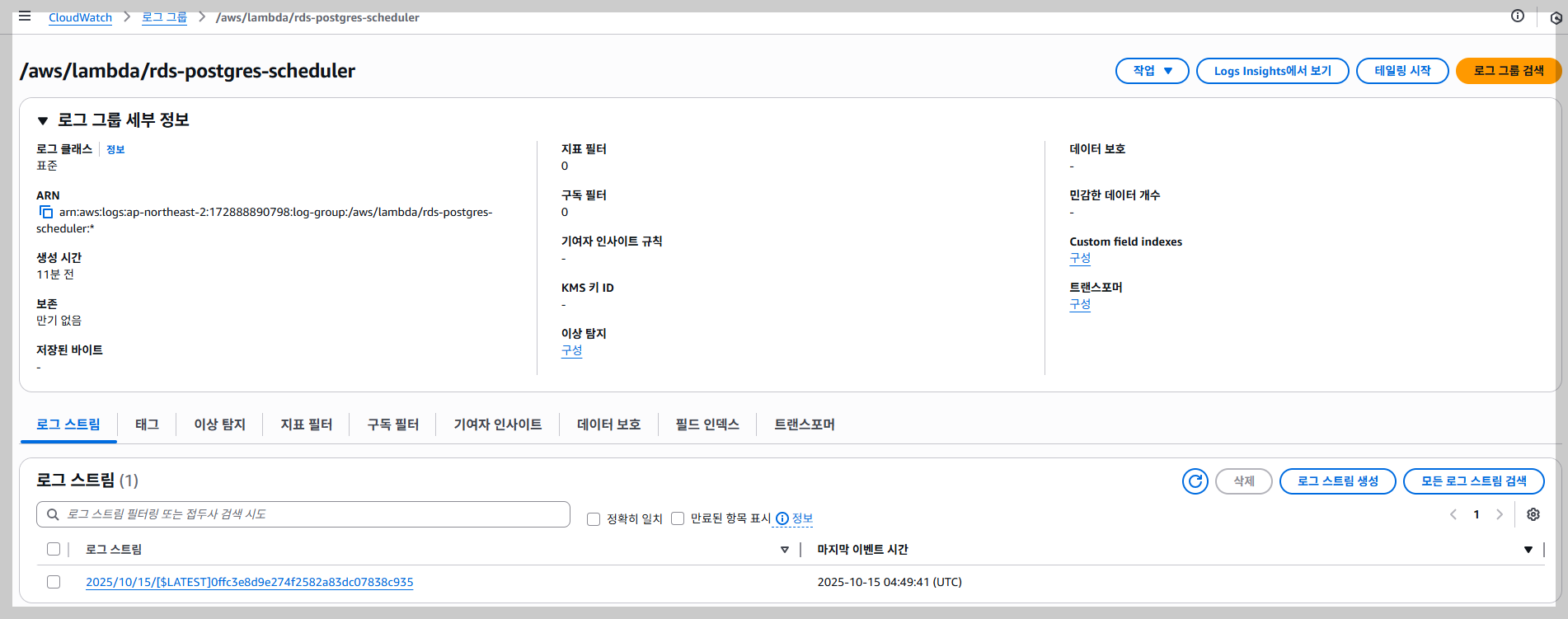 만약, 아래 그림과 같이 로그가 생성이 되지 있지 않으면, 생성한 IAM / 역할 (lambda-rds-scheduler-role)에 CloudWatchLogsFullAccess 권한이 없어서 로그가 생성되지 않은 것이니 추가해 주세요.