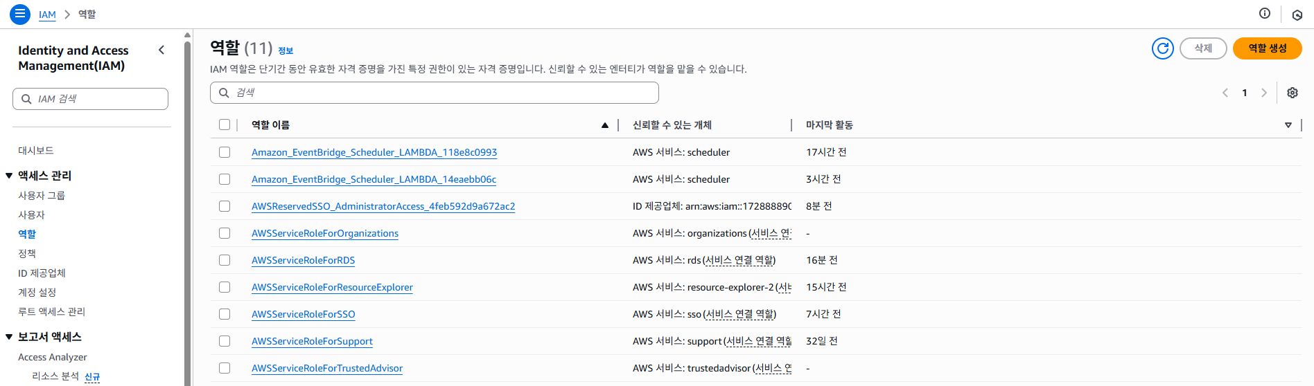 AWS 콘솔 → IAM → 역할 → 역할 생성