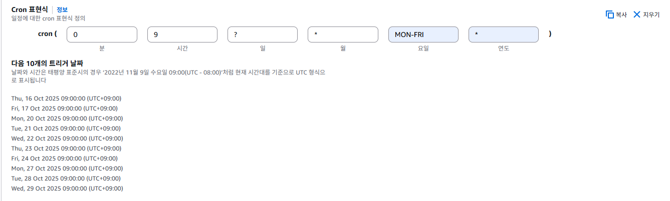 - Cron 표현식 : 0 9 ? * MON-FRI * → 각각의 항목칸에 입력후 아래와 같이 예시로 트리거 되는 일시가 나오니 체크 한다.