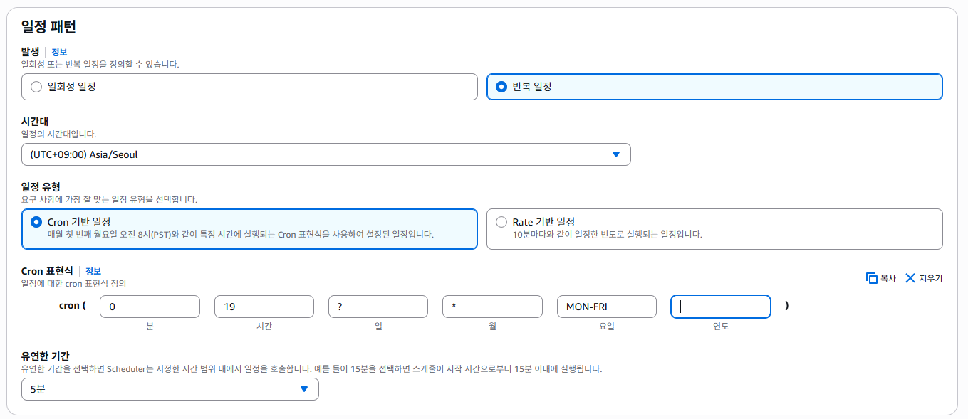 - Cron 표현식 : 0 19 ? * MON-FRI *