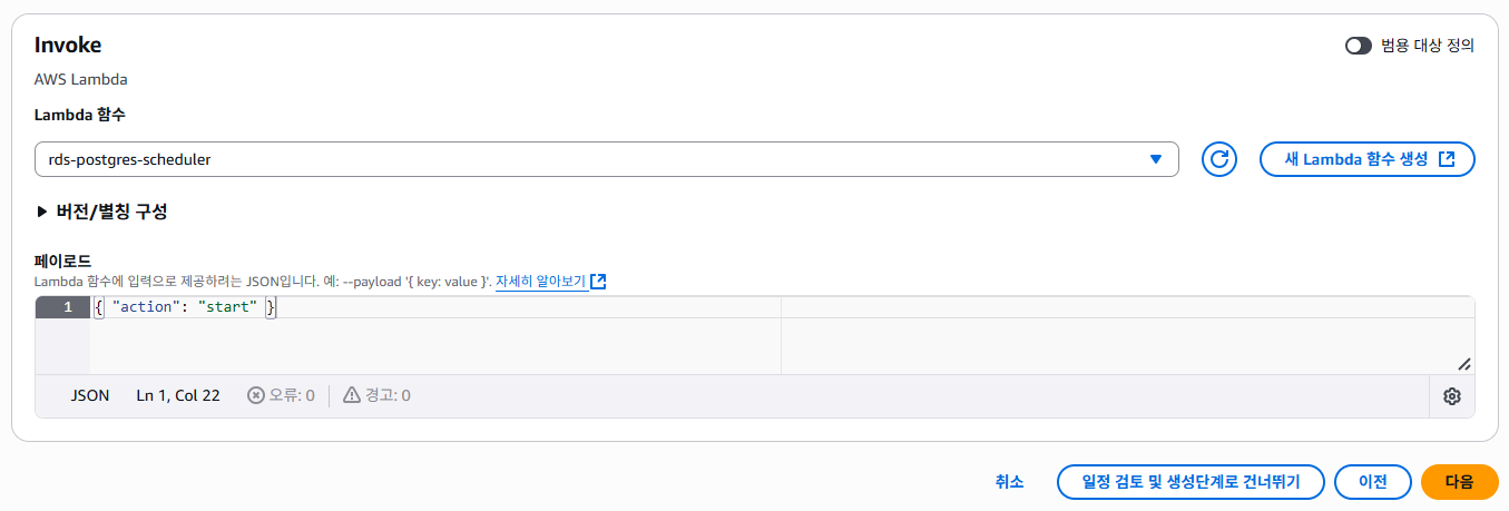 - 실행역할 : 기존 역할 사용 → lambda-rds-scheduler-role 선택
