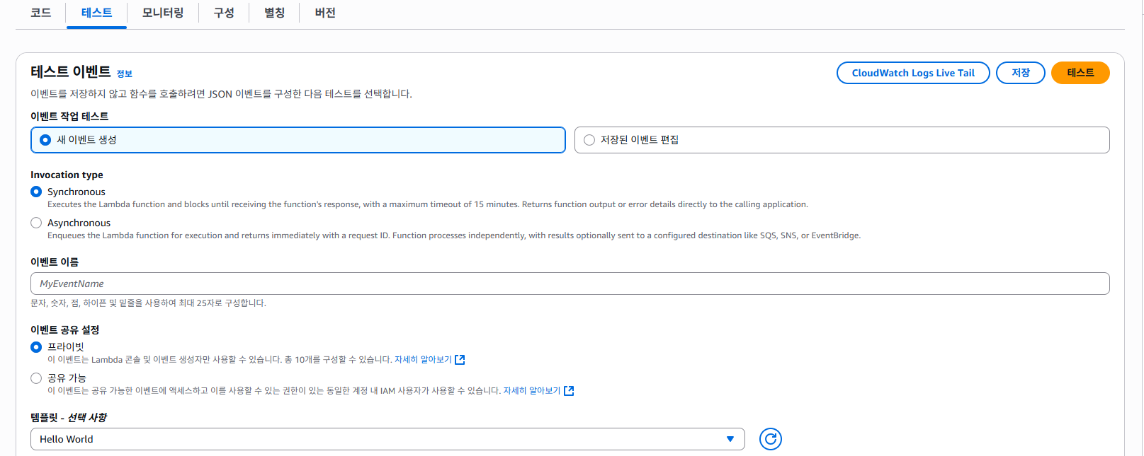- 이벤트 공유 설정 : 기본은 프라이빗을 설정하는데, 다른 IAM 계정으로 테스트 함수를 이용하려면 공유 가능으로 설정. (초기 생성하면 변경이 되지 않으니 수정하려면 다시 재생성해야 함)