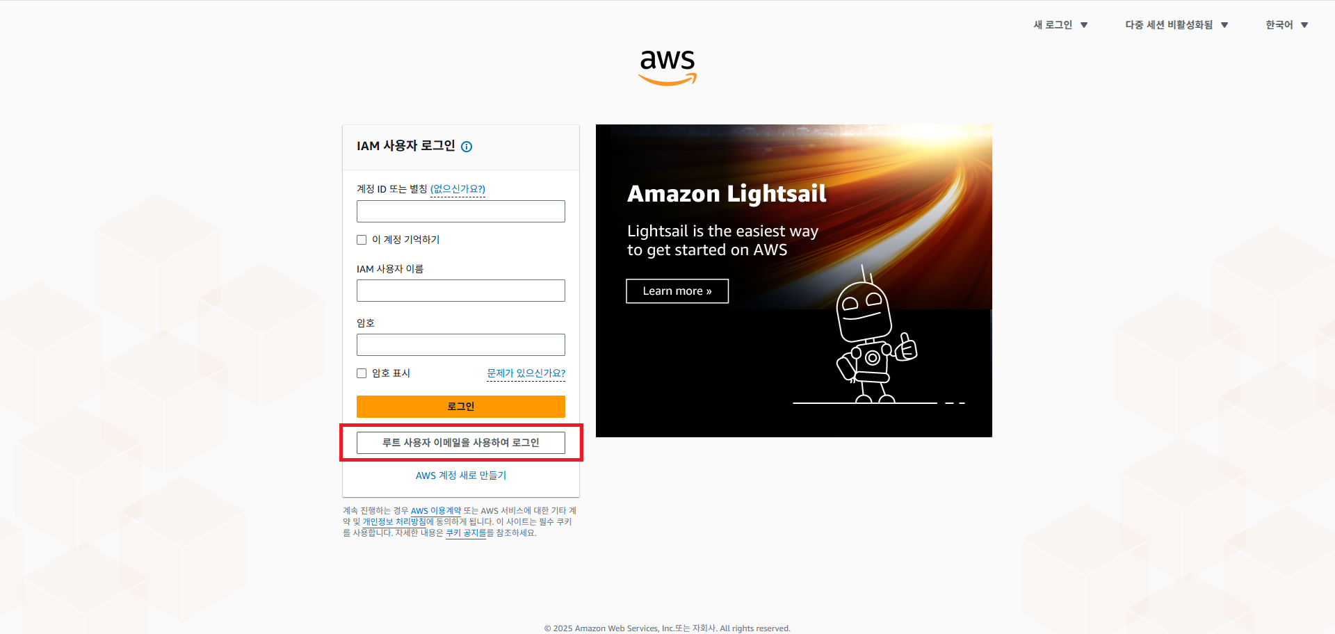 - [루트 사용자 이메일을 사용하여 로그인] 선택