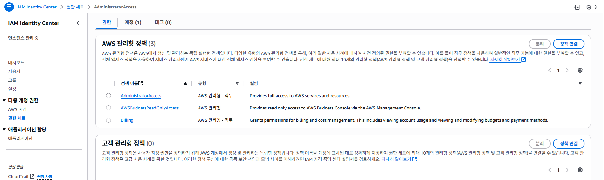 - IAM Identity Center > 다중 계정 권한 > 권한세트 로 이동한다.